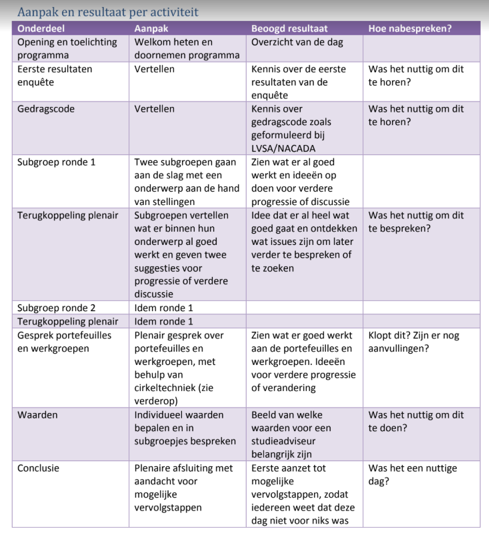 Bij de voorbereiding gebruikte Mirjam onze trainingsontwerptabel. Hierin noteer je wat de verschillende onderdelen zijn, hoe die worden aangepakt, wat ze dienen op te leveren en hoe ieder onderdeel wordt nabesproken. Je kunt haar tabel hier zien. Mirjam had de dag goed voorbereid en doordacht, niet alleen op macroniveau maar ook op microniveau, zelfs met uitgeschreven instructies per onderdeel. Het werken met zo’n heldere structuur werkt ondersteunend voor de motivatie van de deelnemers. Ze weten dan goed wat er verwacht wordt en waarom dat belangrijk is. Binnen de structuur die Mirjam ontworpen had hadden ze veel gelegenheid om hun eigen ideeën naar voren te brengen en met elkaar uit te wisselen. (Lees meer over het combineren van structuur en autonomie).