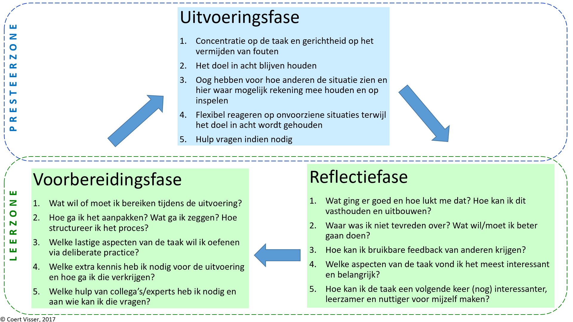 Naar aanleiding van mijn artikel Checklist: 7 vragen om je professionele ontwikkeling te ondersteunen heb ik verschillende gesprekjes gehad met mensen over het belang van het onderscheid maken tussen leren en presteren. Mijn gesprekspartners vonden dit onderscheid interessant en waardevol en hadden belangstelling voor de drie fases die ik noem: de voorbereidingsfase, de uitvoeringsfase en de reflectiefase. De algemene reactie die ik daarop kreeg was dat dit een verhelderende driedeling is en meerdere mensen zeiden dat ze bewuster wilden gaan voorbereiden en reflecteren.