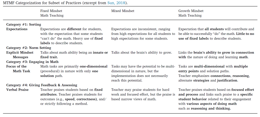 Ze kon de manieren van lesgeven van de leraren beoordelen aan de hand van het zogenaamde Math Teaching for Mindset Framework (MTMF; Sun, 2018). Dit raamwerk ziet er als volgt uit: