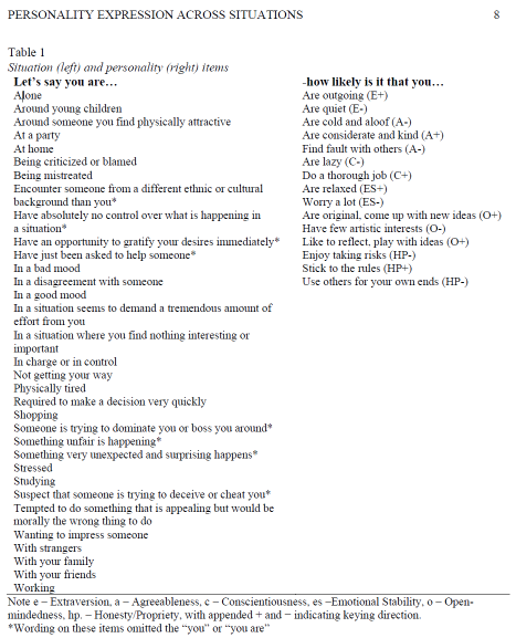 1. De bevindingen waren net als bij Conley & Saucier dat eerlijkheid / fatsoen het minst verschilde over situaties, terwijl emotionele stabiliteit en extraversie het meest verschilden.